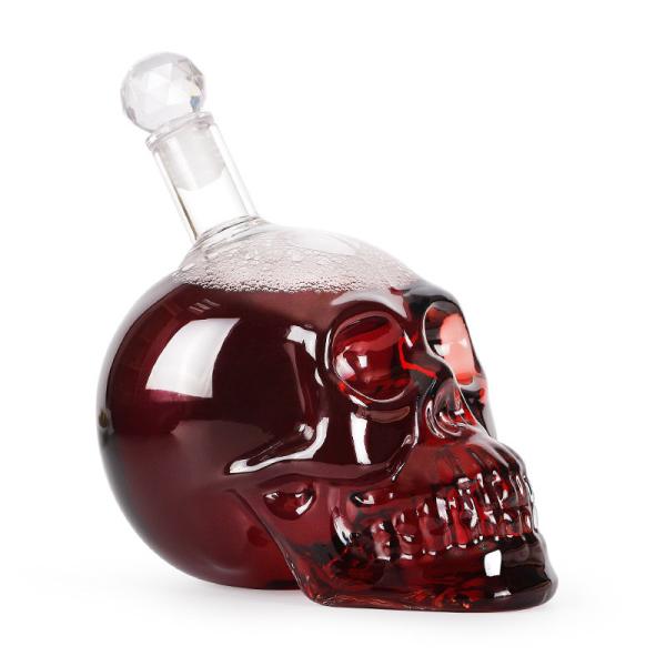 Handcrafted to add a unique design element to the home bar Crafted from solid glass, each liquor decanter contains an intriguing floating glass skull for an eerie feel. Featuring a glass stopper with a rubber base, it can hold in the flavor and aroma of any of your favorite spirits and poisons. Will add a unique design element to the home bar, it plays a key role in creating hauntingly good cocktails.